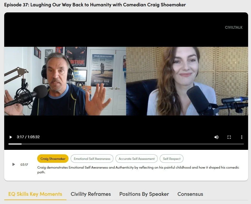 Civil Talk's civility analysis feature powered by Clarion AI, showcasing how it identifies key moments of emotional intelligence and civility.